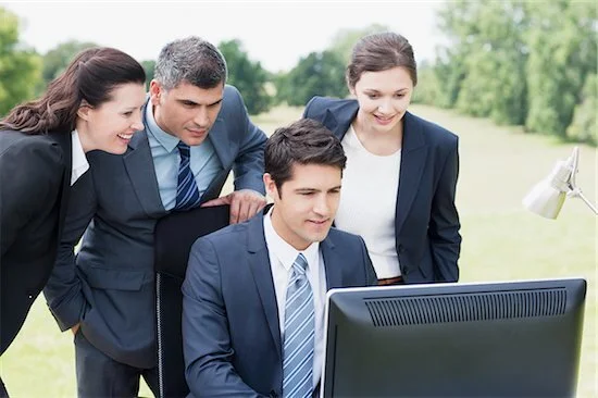 This image feels very posed. Does this look like your team? Why are they on a desktop outside? Is this telling a story or is it just confusing?